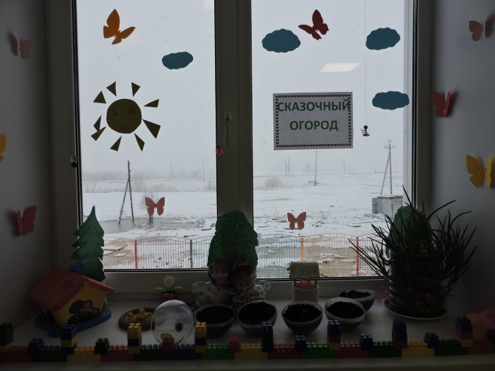 На окне зазеленел «Сказочный огород». Дети сами выращивают лук, посадили укроп, петрушку, огурцы и с удовольствием ухаживают за ними. |